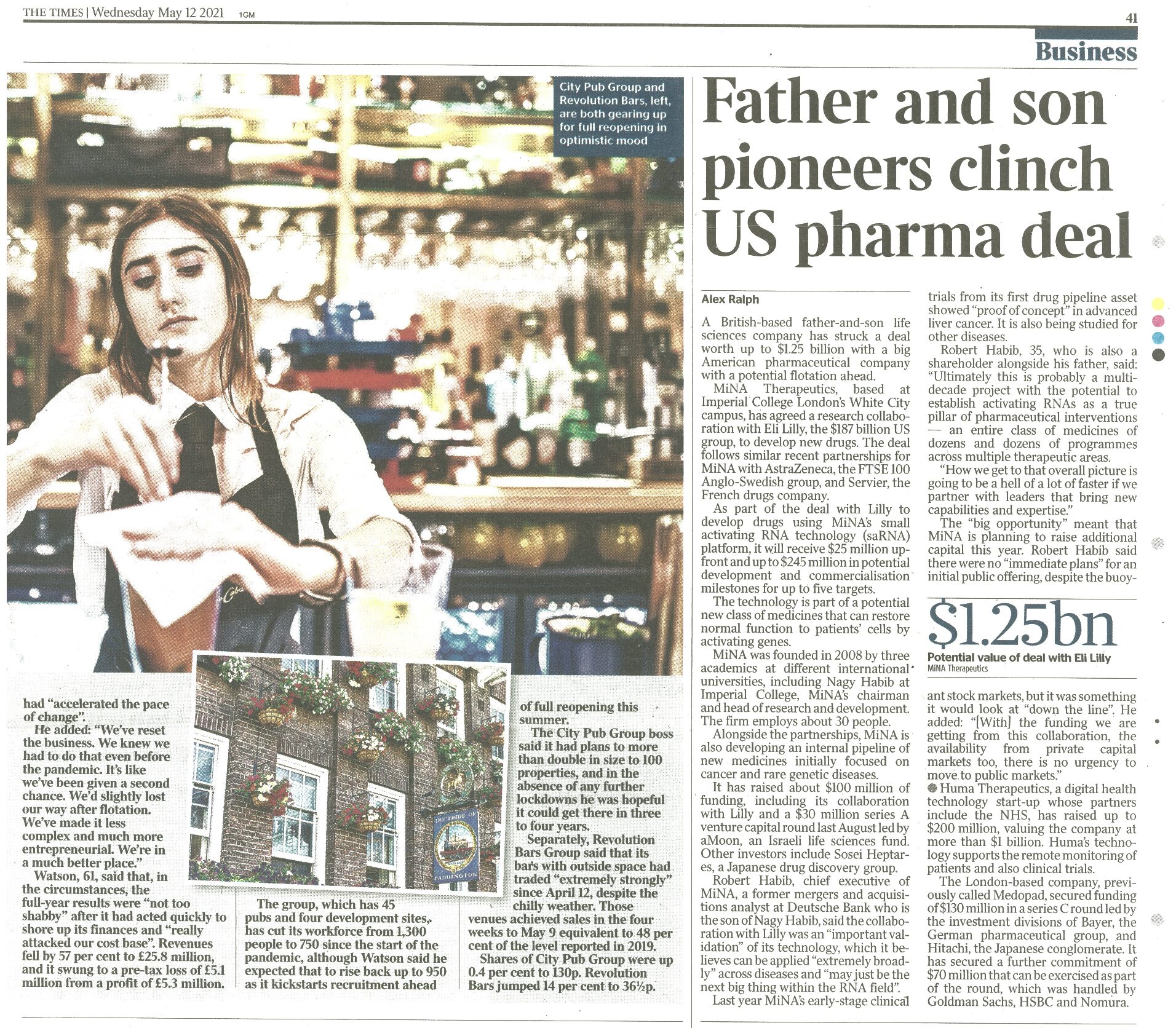 • Co-founder of MiNA Therapeutics (RNA therapeutics), which has raised >$100m in funding through license deals and partnerships with multiple large companies including Eli Lilly, Boehringer Ingelheim, Servier, and Biomarin